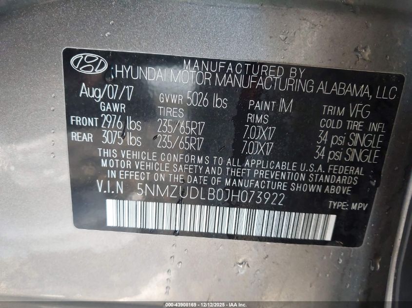 2018 HYUNDAI SANTA FE 2018 року Бензин, 2.4, Полный привод, vin - 5NMZUDLB0JH073922 из США
