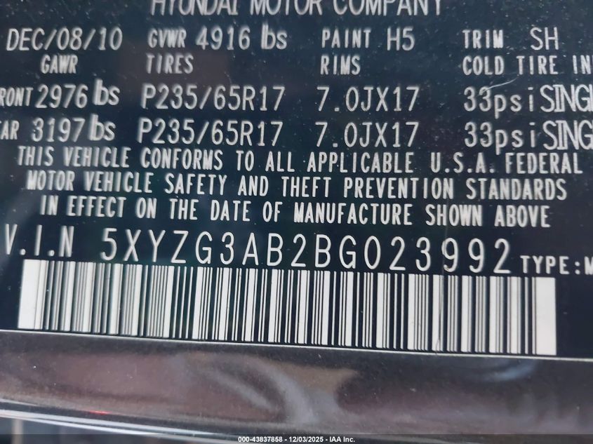 2011 HYUNDAI SANTA FE 2011 року Бензин, 2.4, Передний привод, vin - 5XYZG3AB2BG023992 из США