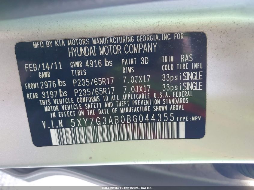 2011 HYUNDAI SANTA FE 2011 року Бензин, 2.4, Передний привод, vin - 5XYZG3AB0BG044355 из США