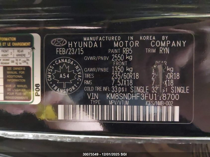 2015 HYUNDAI SANTA FE 2015 року Бензин, , Полный привод, vin - KM8SNDHF3FU118700 из США