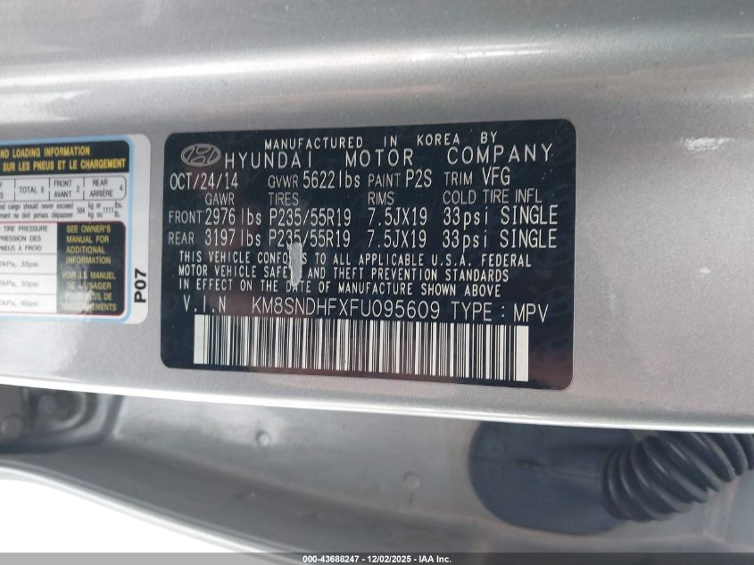 2015 HYUNDAI SANTA FE 2015 року Бензин, 3.3, Полный привод, vin - KM8SNDHFXFU095609 из США