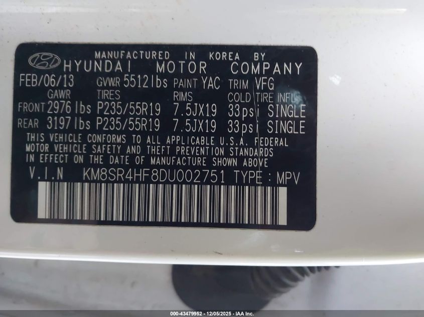 2013 HYUNDAI SANTA FE 2013 року Бензин, 3.3, Передний привод, vin - KM8SR4HF8DU002751 из США