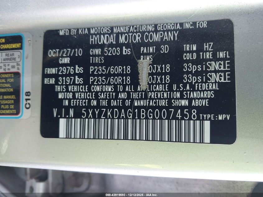 2011 HYUNDAI SANTA FE 2011 року Бензин, 3.5, Полный привод, vin - 5XYZKDAG1BG007458 из США