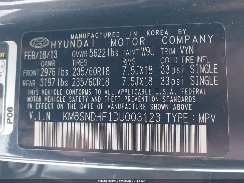 2013 HYUNDAI SANTA FE 2013 року Бензин, 3.3, Полный привод, vin - KM8SNDHF1DU003123 из США