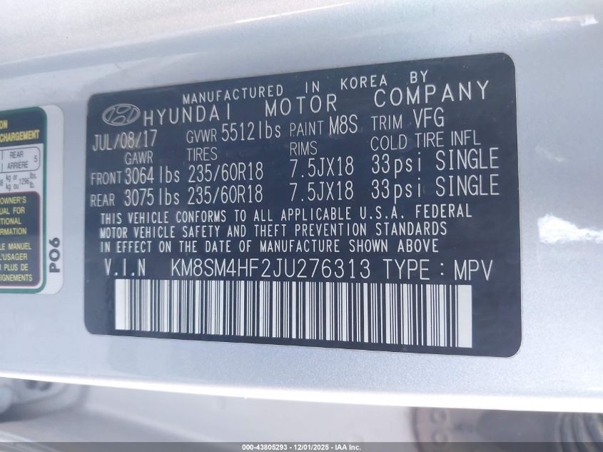 2018 HYUNDAI SANTA FE 2018 року Бензин, 3.3, Передний привод, vin - KM8SM4HF2JU276313 из США