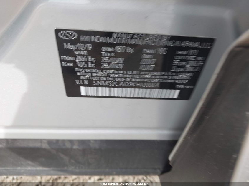 2019 HYUNDAI SANTA FE 2019 року Бензин, 2.4, Полный привод, vin - 5NMS2CAD9KH120064 из США