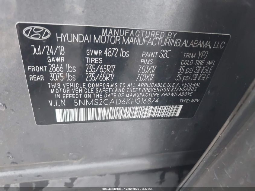 2019 HYUNDAI SANTA FE 2019 року Бензин, 2.4, Полный привод, vin - 5NMS2CAD6KH016874 из США
