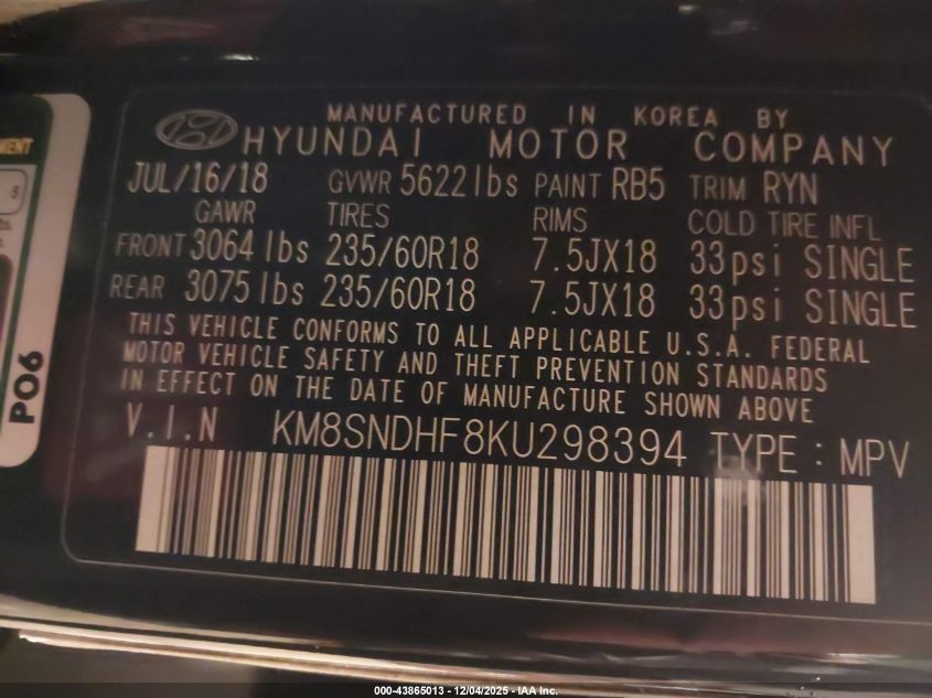 2019 HYUNDAI SANTA FE 2019 року Бензин, 3.3, Полный привод, vin - KM8SNDHF8KU298394 из США