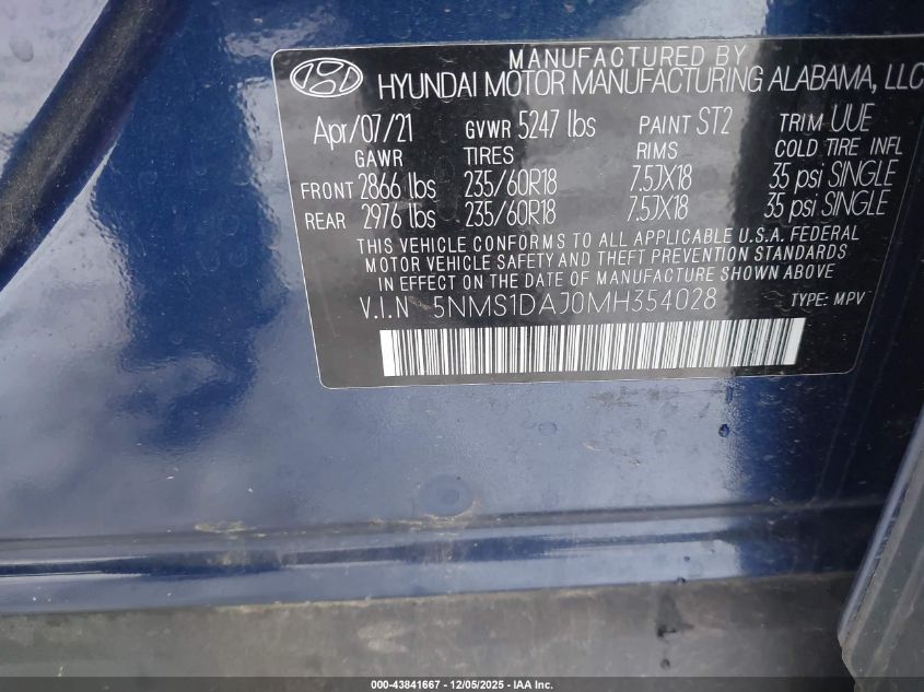 2021 HYUNDAI SANTA FE 2021 року Бензин, 2.5, Полный привод, vin - 5NMS1DAJ0MH354028 из США
