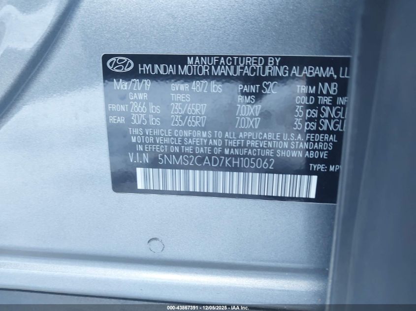 2019 HYUNDAI SANTA FE 2019 року Бензин, 2.4, Полный привод, vin - 5NMS2CAD7KH105062 из США