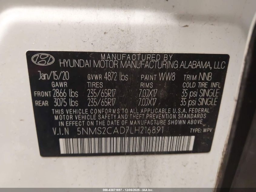 2020 HYUNDAI SANTA FE 2020 року Бензин, 2.4, Полный привод, vin - 5NMS2CAD7LH216891 из США