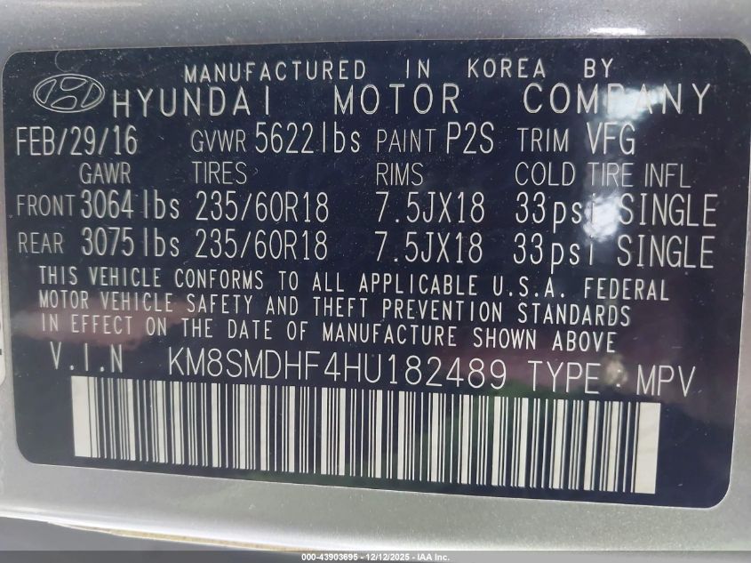 2017 HYUNDAI SANTA FE 2017 року Бензин, 3.3, Полный привод, vin - KM8SMDHF4HU182489 из США