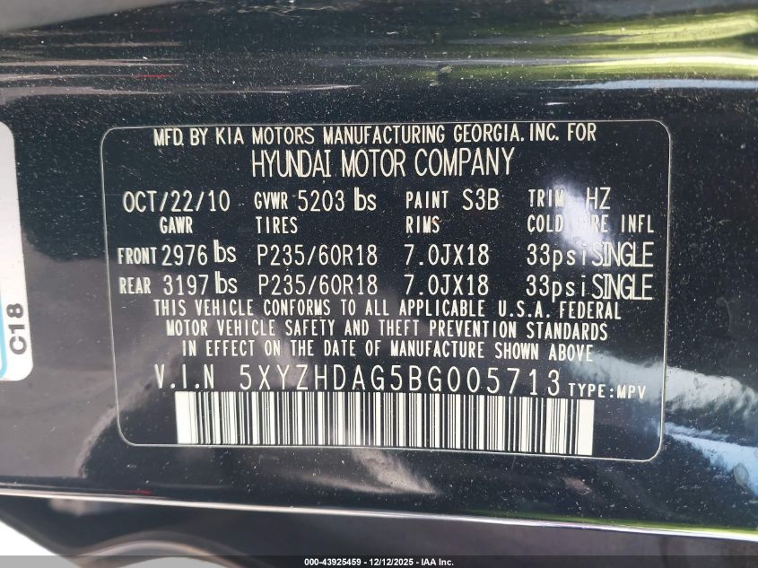 2011 HYUNDAI SANTA FE 2011 року Бензин, 3.5, Полный привод, vin - 5XYZHDAG5BG005713 из США