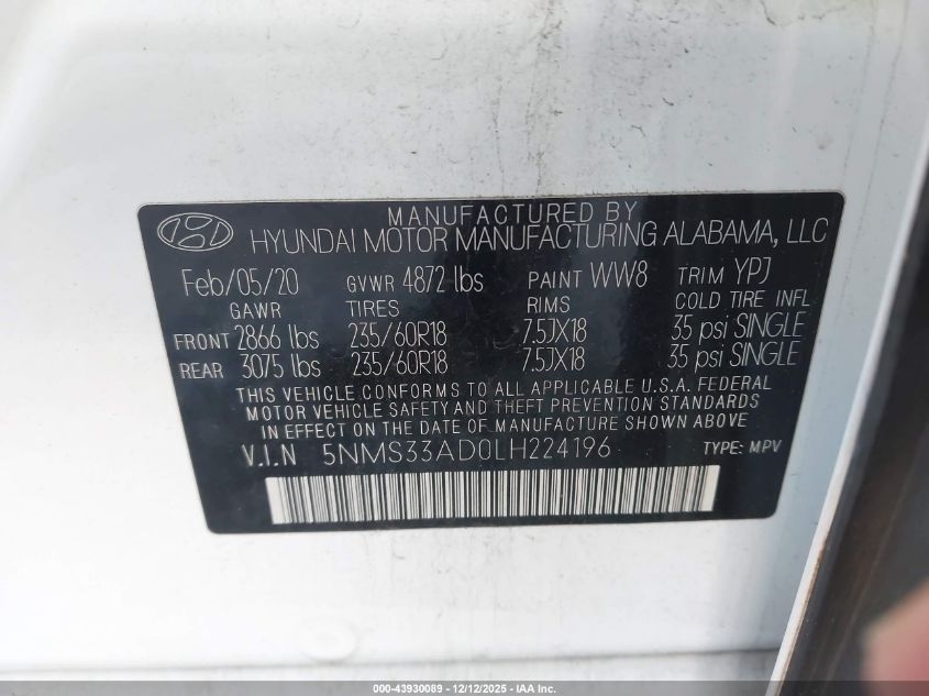 2020 HYUNDAI SANTA FE 2020 року Бензин, 2.4, Передний привод, vin - 5NMS33AD0LH224196 из США