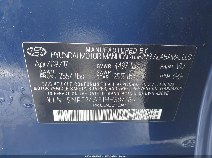 2017 HYUNDAI SONATA 2017 року Бензин, 2.4, Передний привод, vin - 5NPE24AF1HH587785 из США