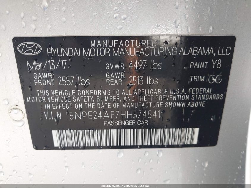 2017 HYUNDAI SONATA 2017 року Бензин, 2.4, Передний привод, vin - 5NPE24AF7HH574541 из США