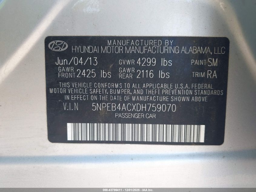 2013 HYUNDAI SONATA 2013 року Бензин, 2.4, Передний привод, vin - 5NPEB4ACXDH759070 из США