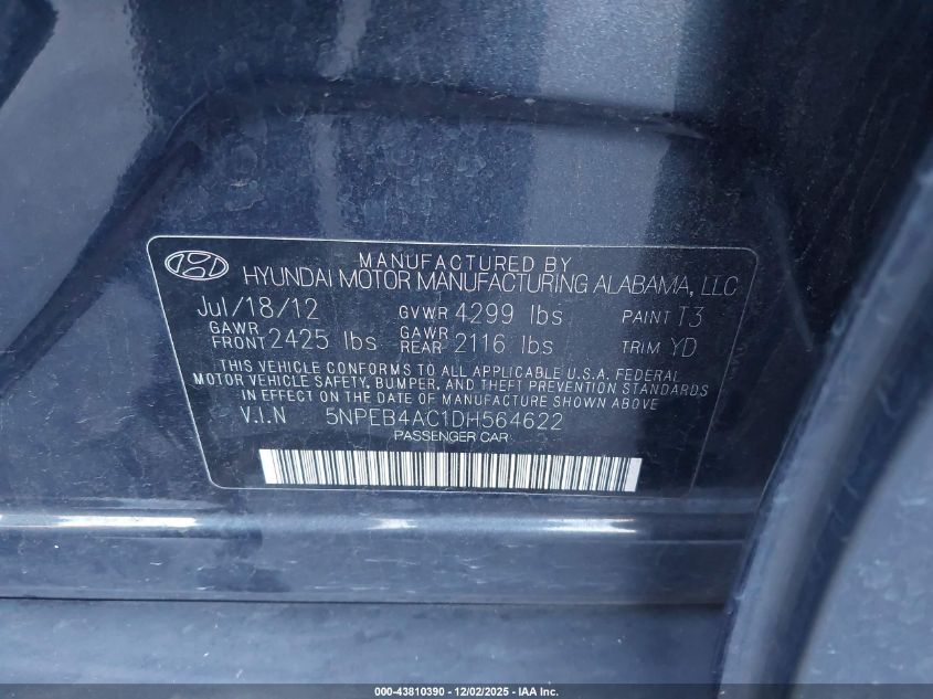2013 HYUNDAI SONATA 2013 року Бензин, 2.4, Передний привод, vin - 5NPEB4AC1DH564622 из США