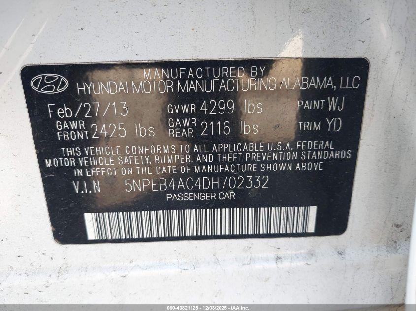 2013 HYUNDAI SONATA 2013 року Бензин, 2.4, Передний привод, vin - 5NPEB4AC4DH702332 из США