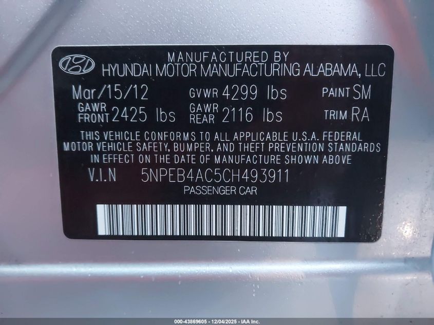 2012 HYUNDAI SONATA 2012 року Бензин, 2.4, Передний привод, vin - 5NPEB4AC5CH493911 из США