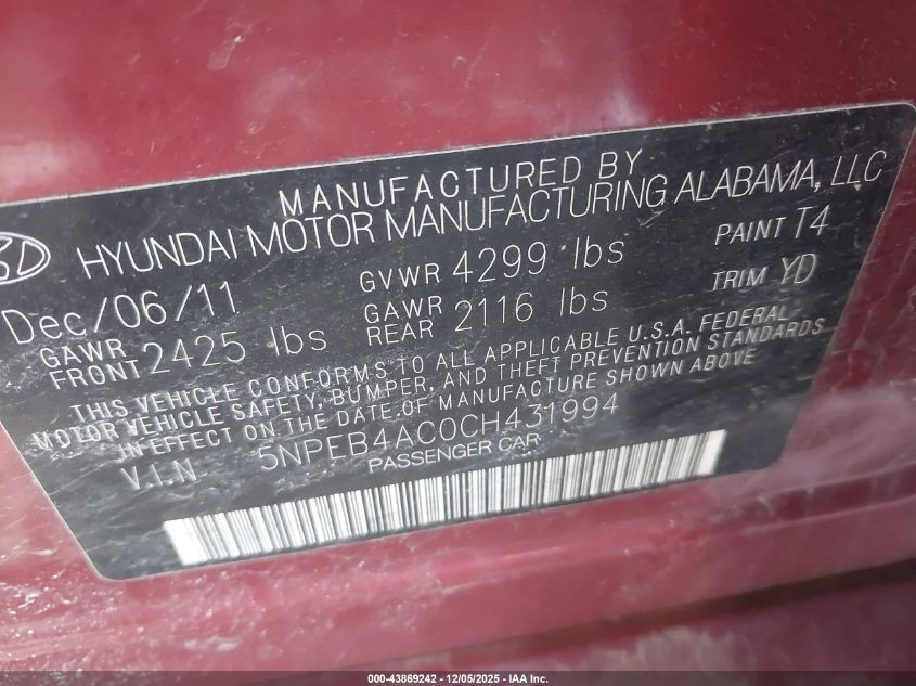2012 HYUNDAI SONATA 2012 року Бензин, 2.4, Передний привод, vin - 5NPEB4AC0CH431994 из США