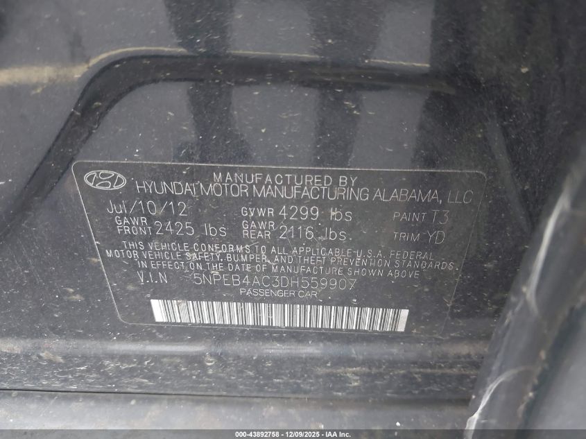2013 HYUNDAI SONATA 2013 року Бензин, 2.4, Передний привод, vin - 5NPEB4AC3DH559907 из США