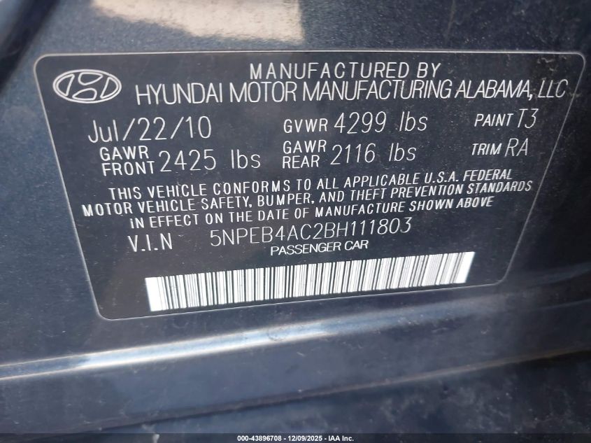 2011 HYUNDAI SONATA 2011 року Бензин, 2.4, Передний привод, vin - 5NPEB4AC2BH111803 из США