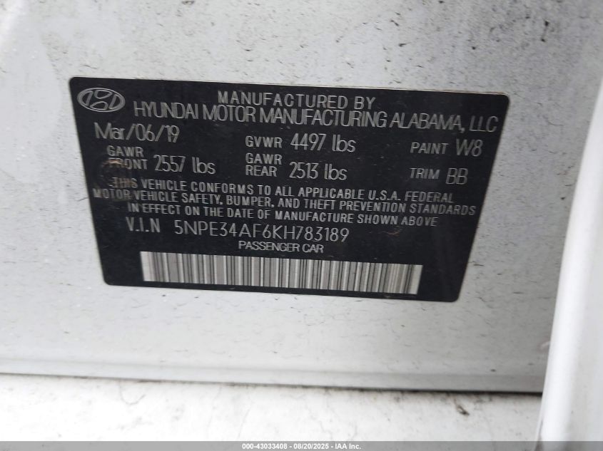 2019 HYUNDAI SONATA 2019 року Бензин, 2.4, Передний привод, vin - 5NPE34AF6KH783189 из США