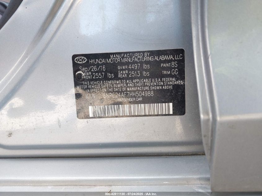 2017 HYUNDAI SONATA 2017 року Бензин, 2.4, Передний привод, vin - 5NPE24AF7HH504988 из США