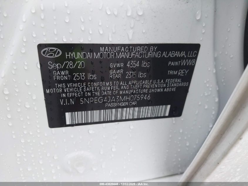 2021 HYUNDAI SONATA 2021 року Бензин, 2.5, Передний привод, vin - 5NPEG4JA3MH075946 из США