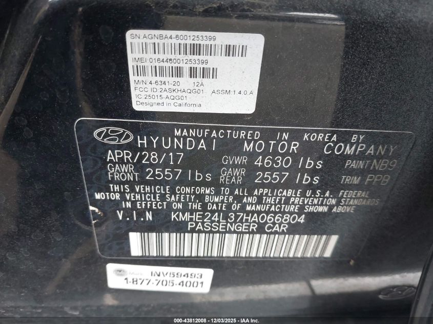 2017 HYUNDAI SONATA 2017 року Гибрид, 2.0, Передний привод, vin - KMHE24L37HA066804 из США
