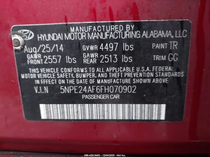 2015 HYUNDAI SONATA 2015 року Бензин, 2.4, Передний привод, vin - 5NPE24AF6FH070902 из США
