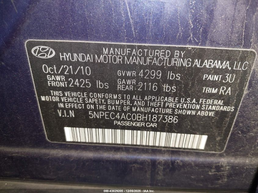 2011 HYUNDAI SONATA 2011 року Бензин, 2.4, Передний привод, vin - 5NPEC4AC0BH187386 из США