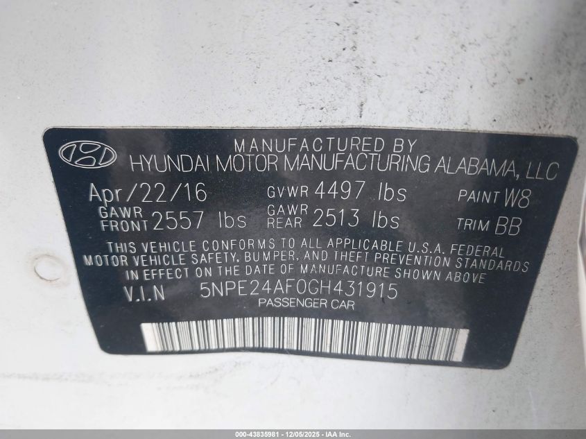 2016 HYUNDAI SONATA 2016 року Бензин, 2.4, Передний привод, vin - 5NPE24AF0GH431915 из США