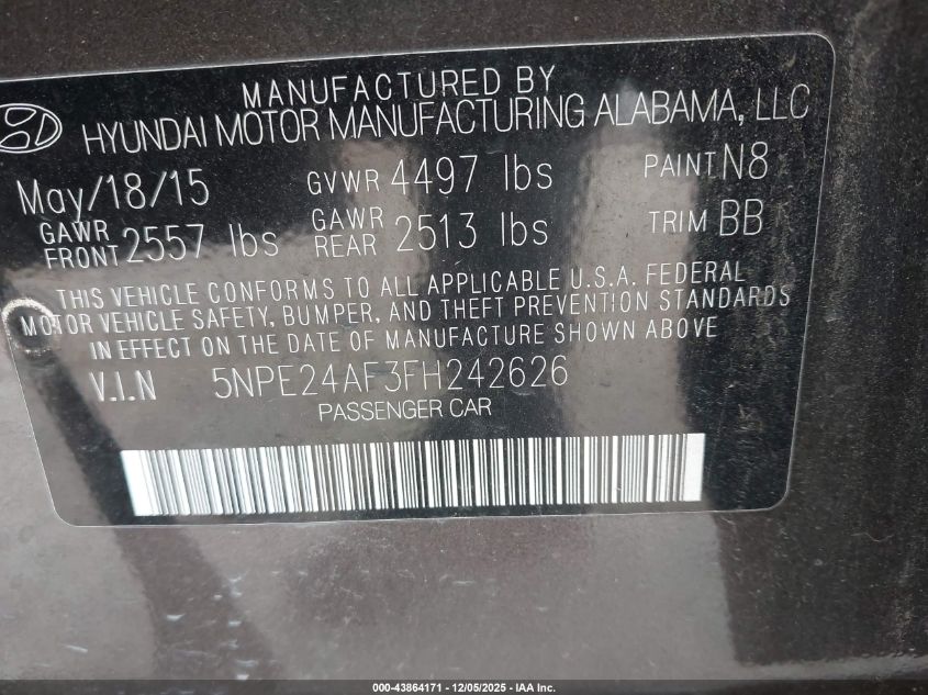 2015 HYUNDAI SONATA 2015 року Бензин, 2.4, Передний привод, vin - 5NPE24AF3FH242626 из США