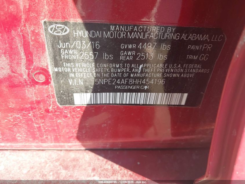 2017 HYUNDAI SONATA 2017 року Бензин, 2.4, Передний привод, vin - 5NPE24AF8HH454196 из США