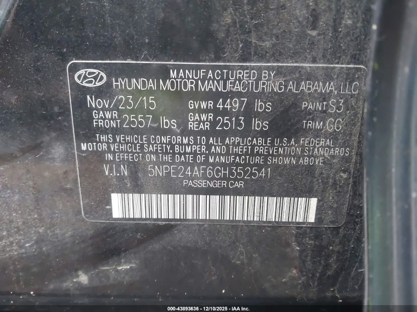 2016 HYUNDAI SONATA 2016 року Бензин, 2.4, Передний привод, vin - 5NPE24AF6GH352541 из США