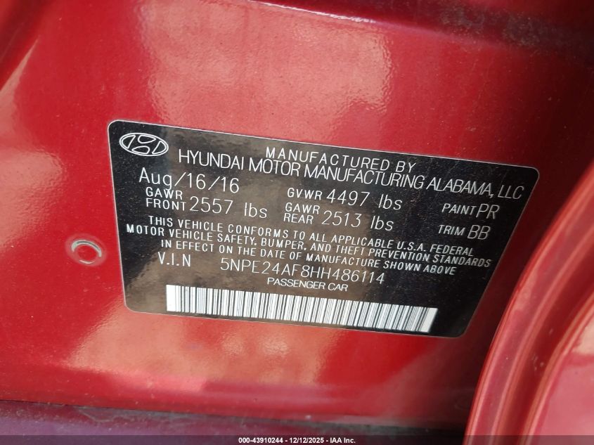 2017 HYUNDAI SONATA 2017 року Бензин, 2.4, Передний привод, vin - 5NPE24AF8HH486114 из США