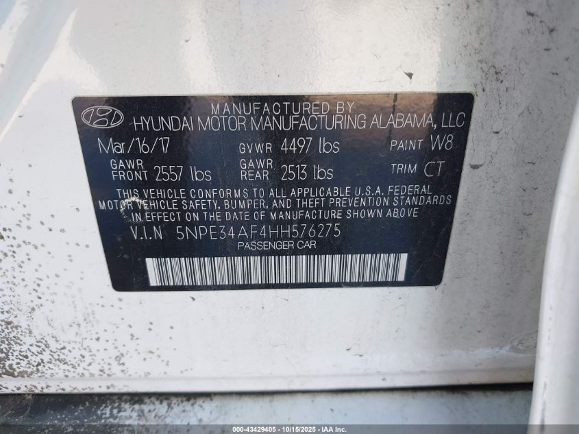 2017 HYUNDAI SONATA 2017 року Бензин, 2.4, Передний привод, vin - 5NPE34AF4HH576275 из США