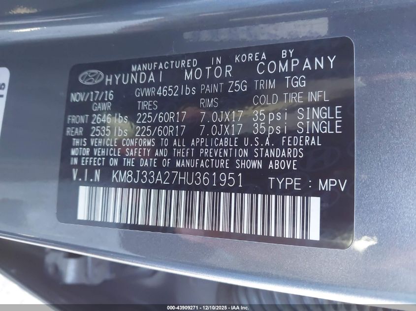 2017 HYUNDAI TUCSON 2017 року Бензин, 1.6, Передний привод, vin - KM8J33A27HU361951 из США