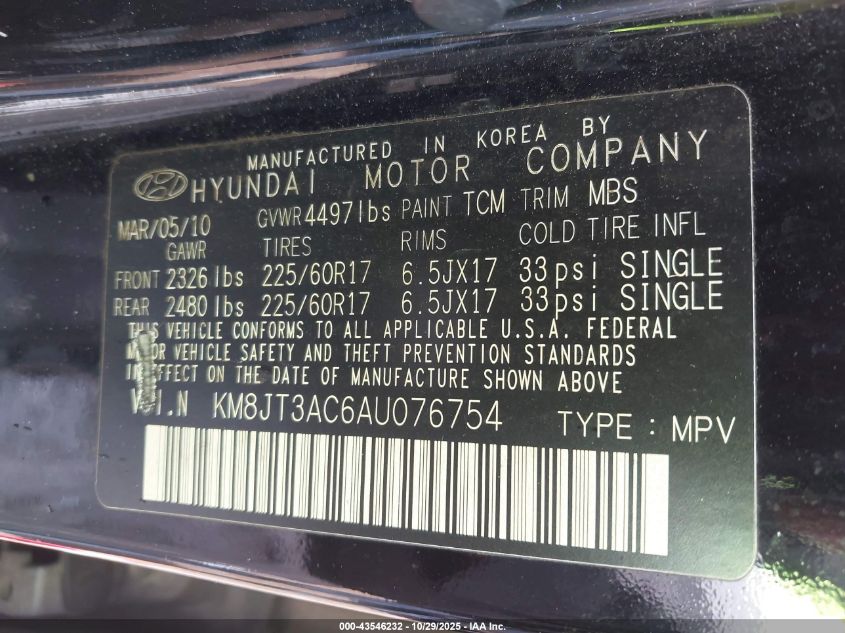 Цвет ЧерныйЦилиндры 4Привод Передний приводVIN KM8JT3AC6AU076754Состояние СтационарноПовреждения Передняя или задняя AutoRIA
