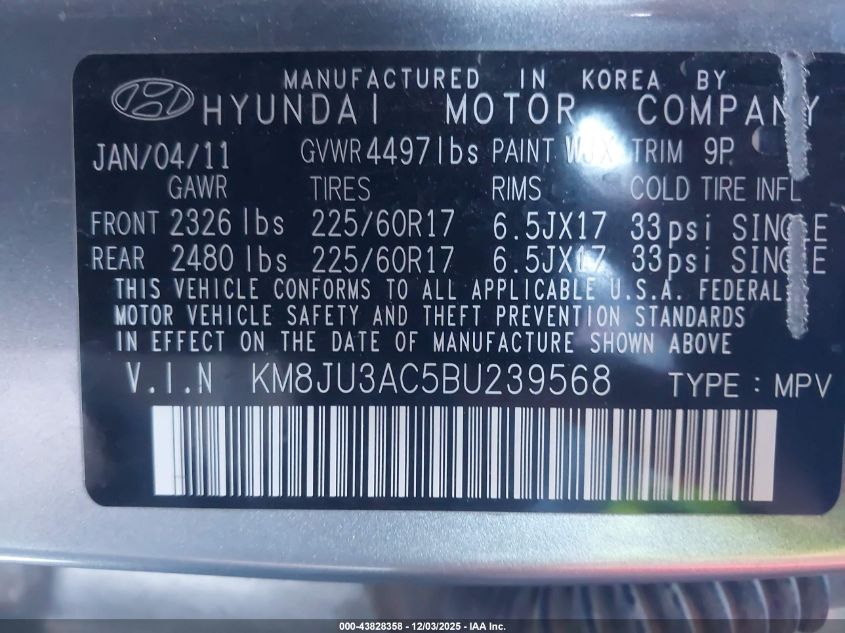 2011 HYUNDAI TUCSON 2011 року Бензин, 2.4, Передний привод, vin - KM8JU3AC5BU239568 из США