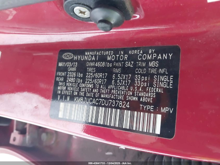 2013 HYUNDAI TUCSON 2013 року Бензин, 2.4, Полный привод, vin - KM8JUCAC7DU737824 из США