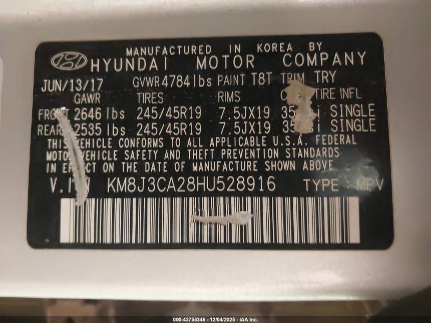 2017 HYUNDAI TUCSON 2017 року Бензин, 1.6, Полный привод, vin - KM8J3CA28HU528916 из США