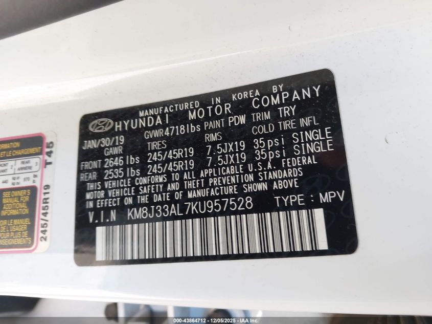 2019 HYUNDAI TUCSON 2019 року Бензин, 2.4, Передний привод, vin - KM8J33AL7KU957528 из США