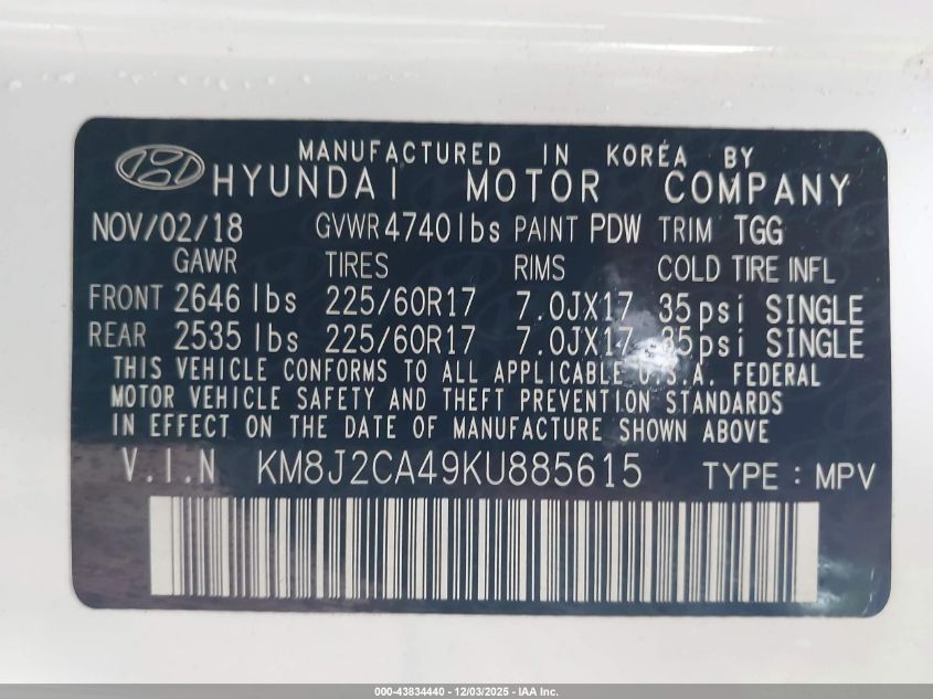 2019 HYUNDAI TUCSON 2019 року Бензин, 2.0, Полный привод, vin - KM8J2CA49KU885615 из США