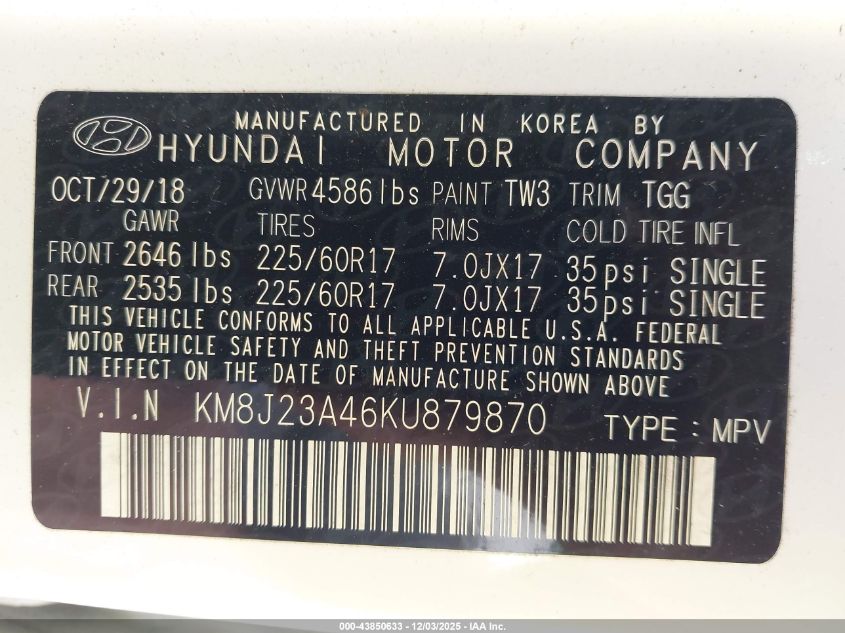 2019 HYUNDAI TUCSON 2019 року Бензин, 2.0, Передний привод, vin - KM8J23A46KU879870 из США