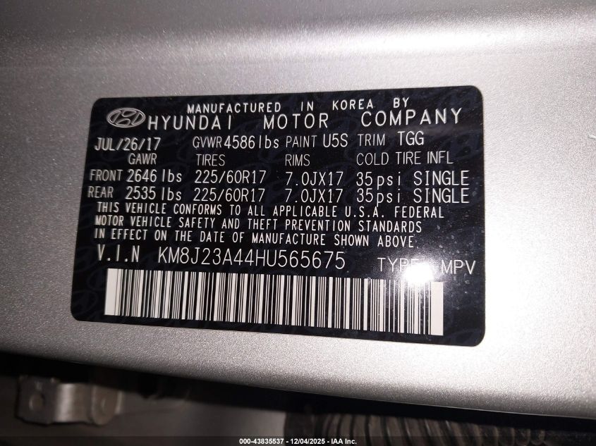 2017 HYUNDAI TUCSON 2017 року Бензин, 2.0, Передний привод, vin - KM8J23A44HU565675 из США