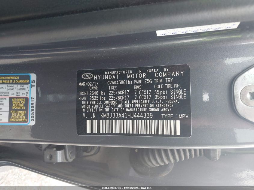 2017 HYUNDAI TUCSON 2017 року Бензин, 2.0, Передний привод, vin - KM8J33A41HU444339 из США