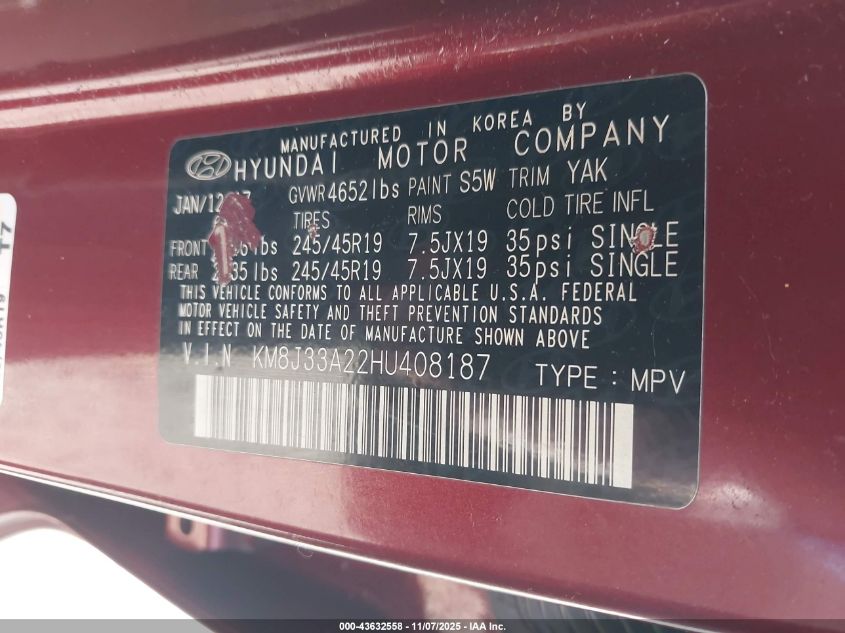2017 HYUNDAI TUCSON 2017 року Бензин, 1.6, Передний привод, vin - KM8J33A22HU408187 из США